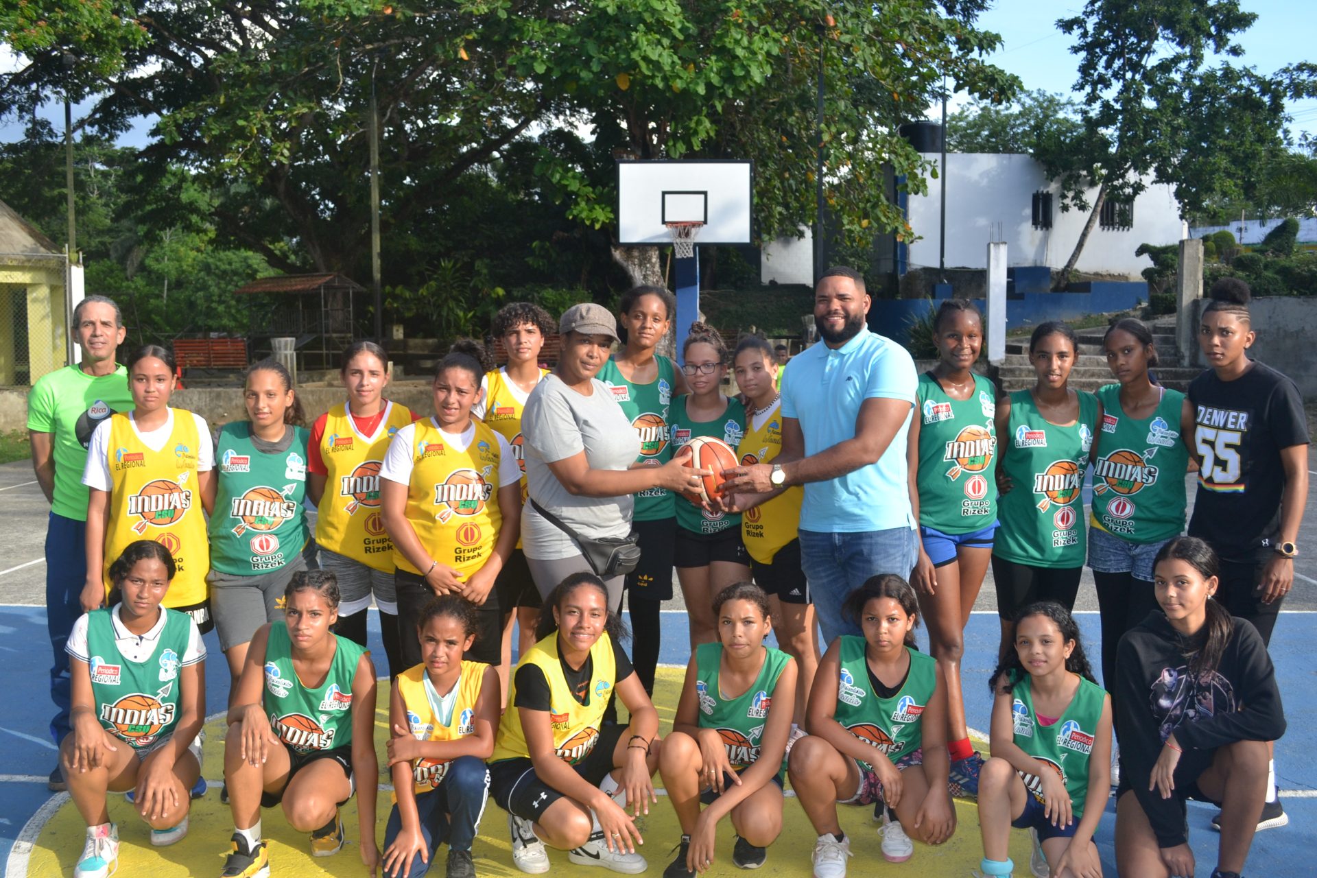 Diógenes Romano entrega útiles deportivos a los entrenadores y jugadoras de las indias del club San Vicente. Fuente Externa.