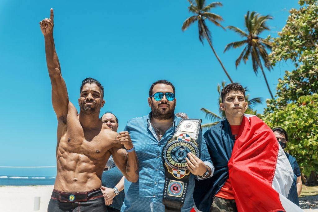 Jhonasky Sojo al momento en que el promotor Rodolfo Dauhajre le colocaba el cinturón que lo declara campeón ligero de Fighting Force. Fuente Externa.