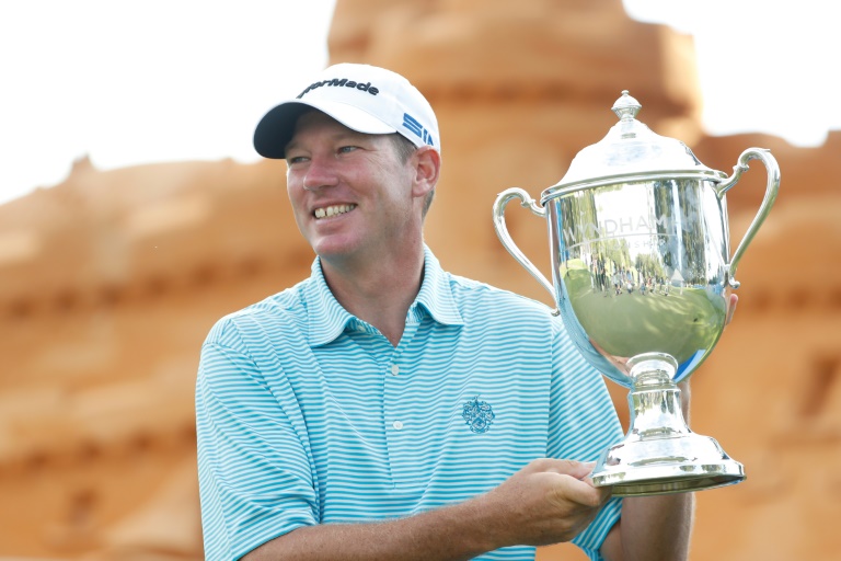 El estadounidense Jim Herman celebra con el trofeo tras ganar el Wyndham Championship en Carolina del Norte, por el PGA Tour/ Fuente Externa