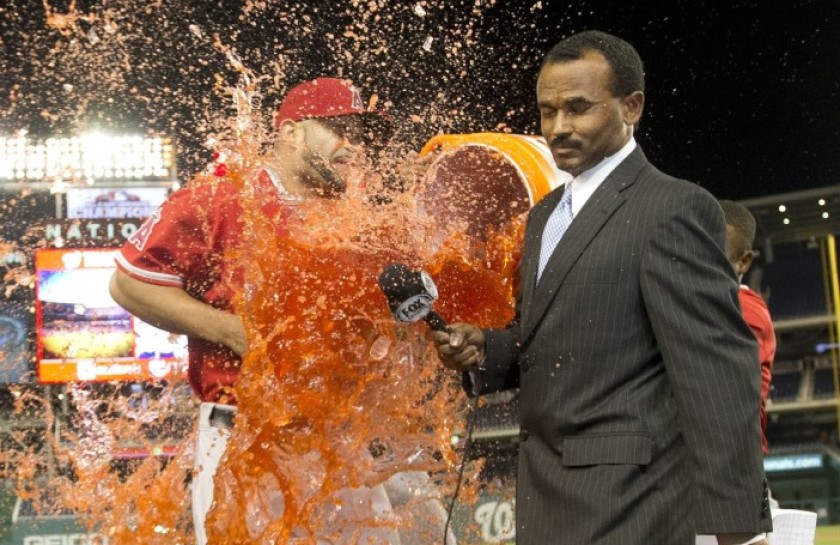 José Mota entrevista al bateador de los Angels Albert Pujols y ambos reciben una ducha de Gatorade.