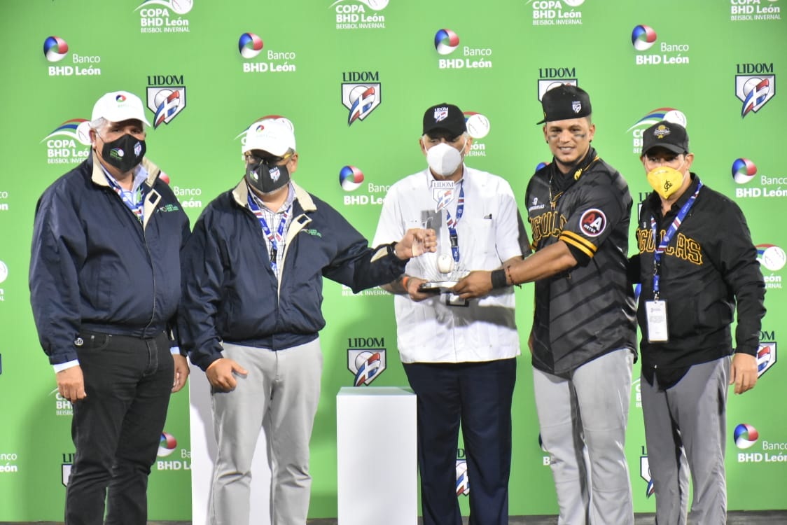 Juan Lagares, recibe el trofeo de Jugador Más Valioso, de la Serie Final 2020-21 que ganaron las Águilas a los Gigantes. La entrega la realiza Vitelio Mejía, presidente de Lidom, junto a funcionarios del Banco BHD-León. Fotomen