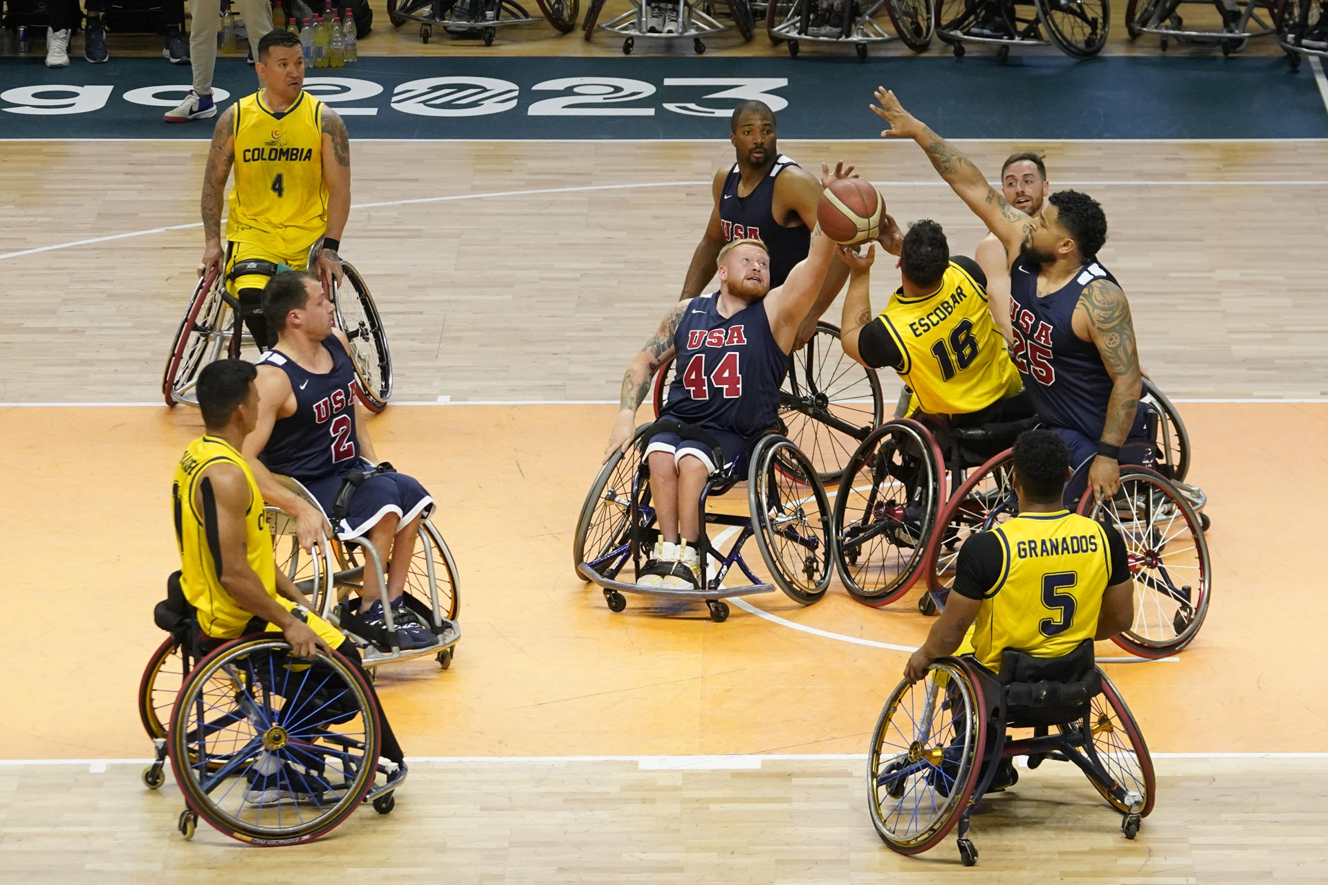 Jeromie Meyer (c) de Estados Unidos disputa el balón con Juan Escobar (c-d) de Colombia en el partido por la medalla de oro en baloncesto en silla de ruedas masculino durante los Juegos Parapanamericanos 2023 en Santiago (Chile). Foto de archivo. EFE/ Adriana Thomasa