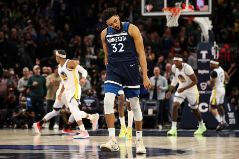 Karl-Anthony Towns, de los Minnesota Timberwolves, celebra un triple en el partido del martes ante lso Golden State Warriors. Fuente Externa.