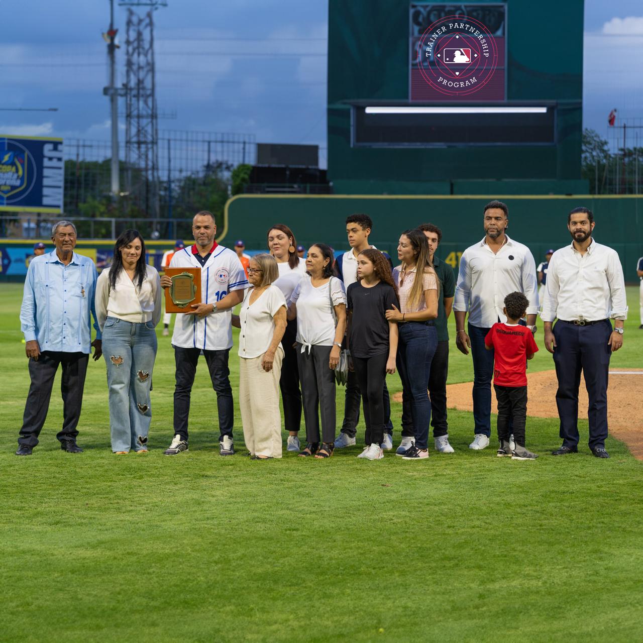 Samuel recibió una placa en compañía de Rebecca Seesel, Henry González, Yerik Pérez, Miguel Matos, ejecutivos de MLB, quienes le dedicaron el torneo de la Región Este.