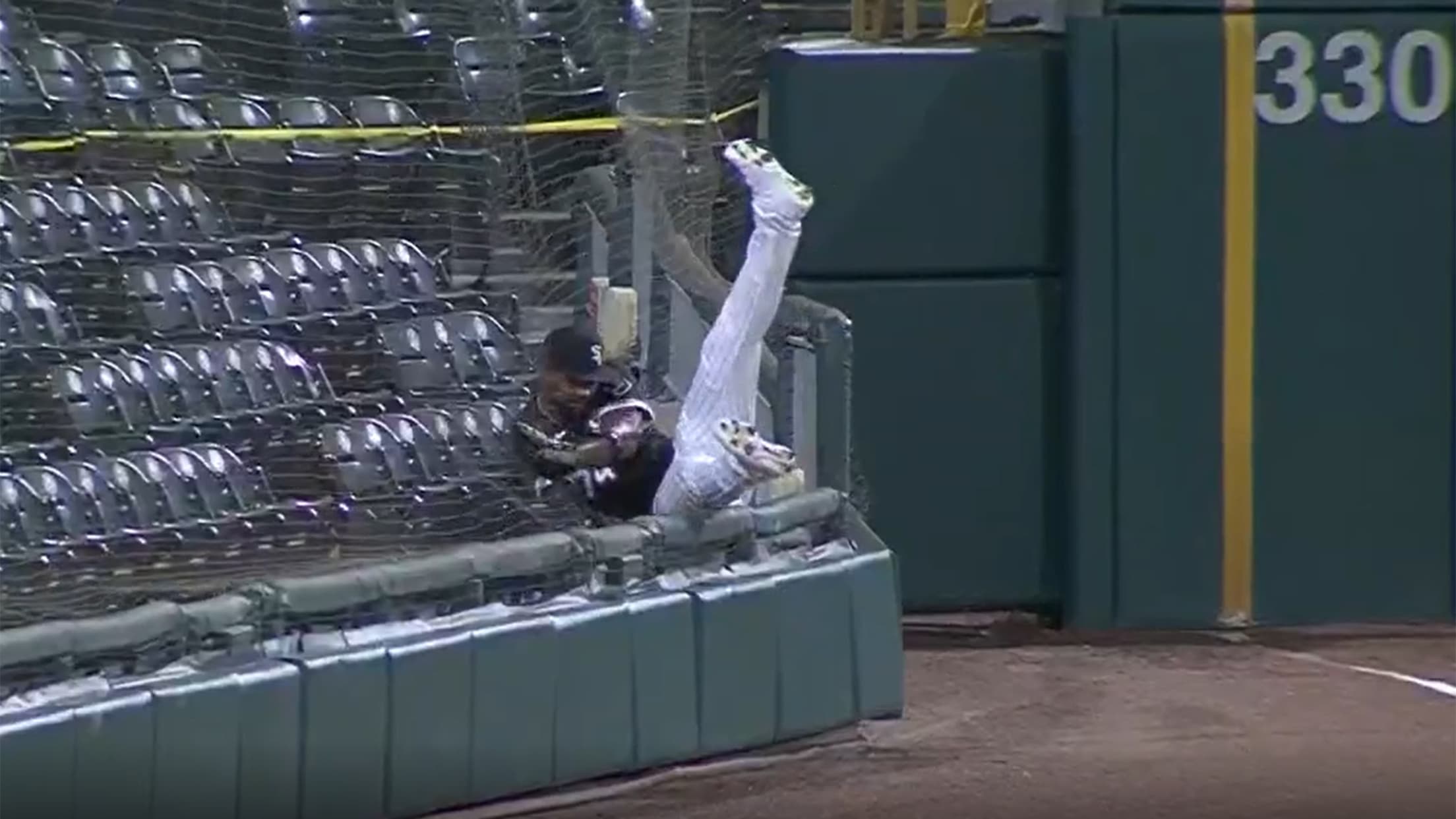 Eloy Jiménez no pudo tomar la pelota y quedó atrapado en la malla/ Fuente Externa
