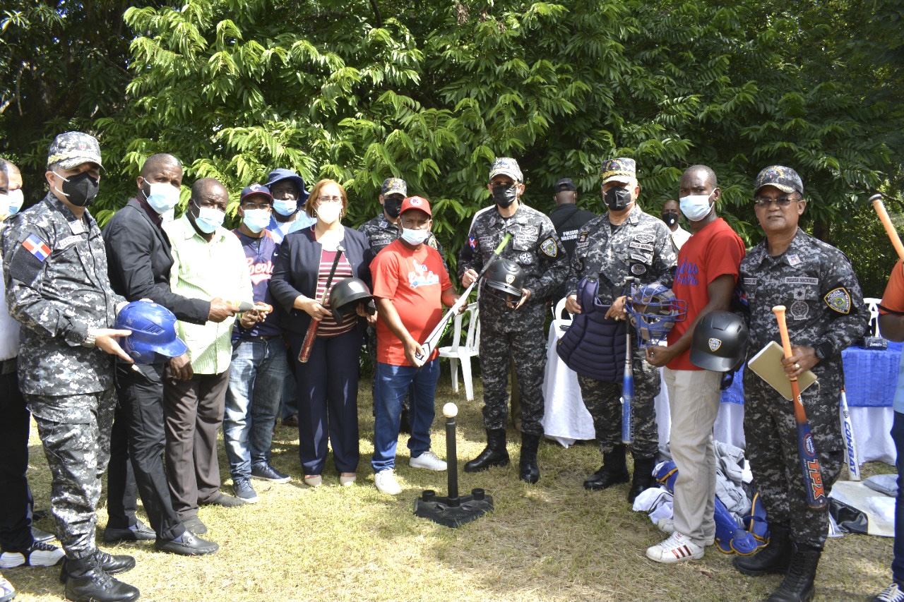 HATILLO, SAN CRISTÓBAL. El director general de la Policía Nacional, continuando su amplio programa deportivo dirigido hacia los niños, entregó en esta comunidad una gran cantidad de equipos para la práctica de béisbol, en compañía de la gobernadora provincial Pura Casilla.