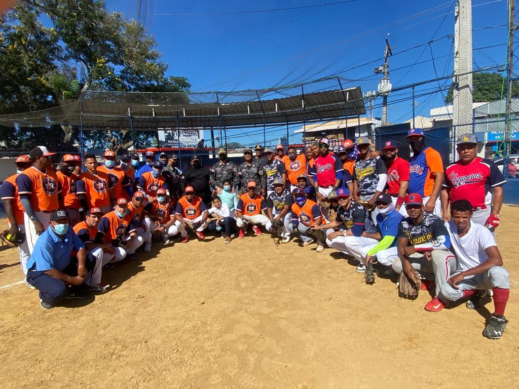El general Orisson Olivence Minaya, los coroneles Jacobo Mateo Moquete y José Francisco De la Cruz comparten con los miembros de los equipos Jefatura Policía Nacional y Los Laguneros, antes de iniciar los juegos. Fuente Externa.