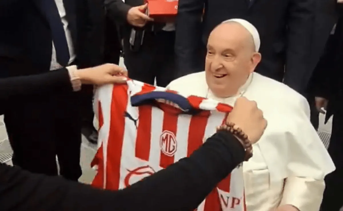 El Papa Francisco recibió la playera blanca y roja de Chivas, la cual fue confeccionada con el número 1 y su nombre detrás.