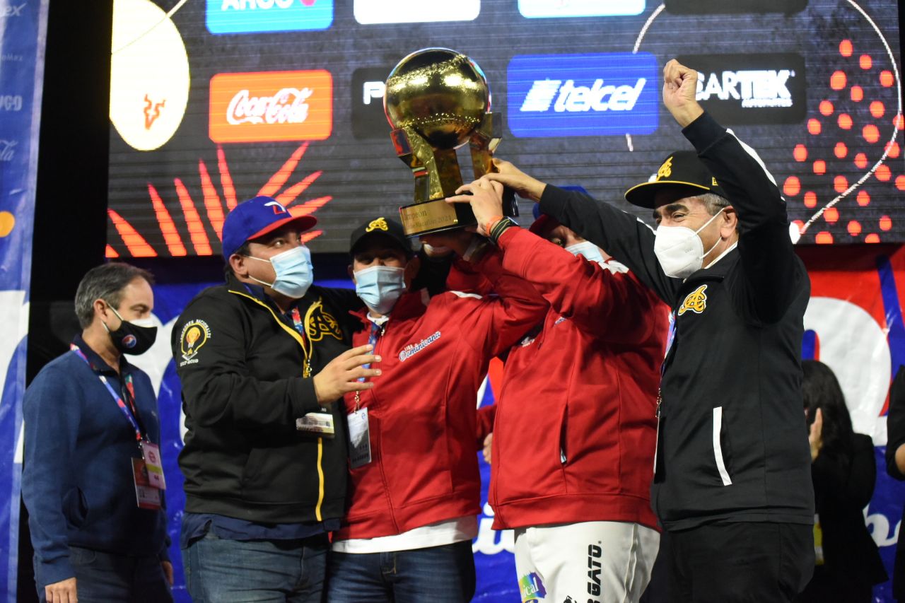 Ejecutivos y peloteros de las Águilas reciben y exhiben el trofeo de Campeón de la Serie del Caribe 2021/ Fuente Externa