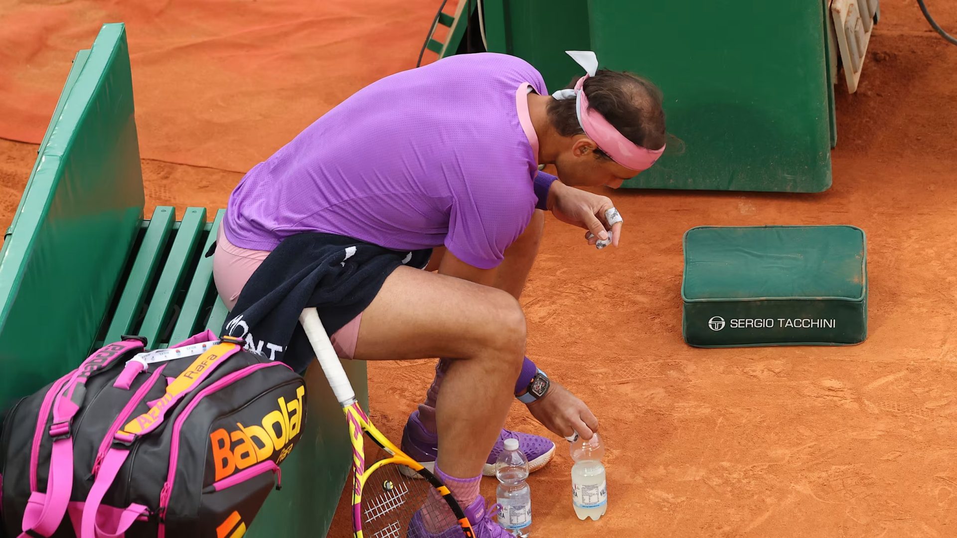 Rafa, doble campeón olímpico, se sinceró en sus memorias sobre algunos de sus hábitos. Dijo: «Tengo que poner las dos botellas a mis pies, delante de mi silla a mi izquierda, una detrás de la otra, apuntando diagonalmente a la pista».