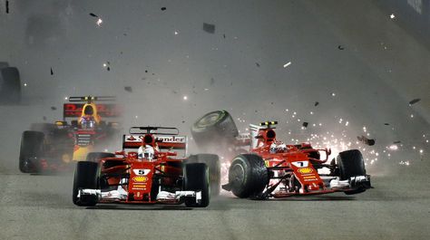 Vettel, que en choque fue el más afectado, se retiró de inmediato con el alerón trasero completamente roto.