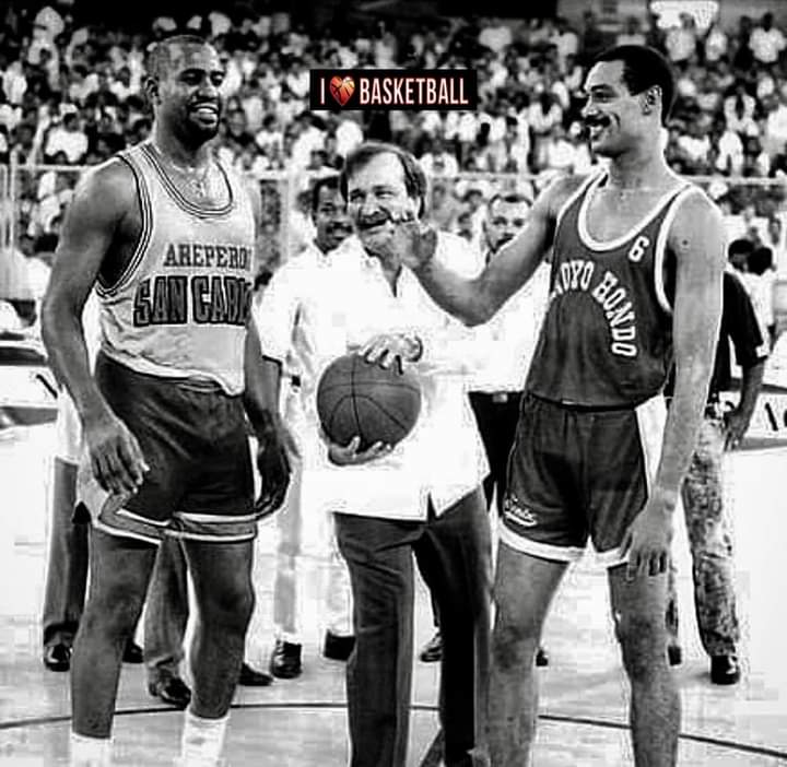 Tomás Troncoso realiza un saque de honor en las finales de 1990 en el basket distrital. Figuran los jugadores Mario Butler, de San Carlos y Felipe Payano, de Arroyo Hondo en el Palacio de los Deportes. Fuente Externa