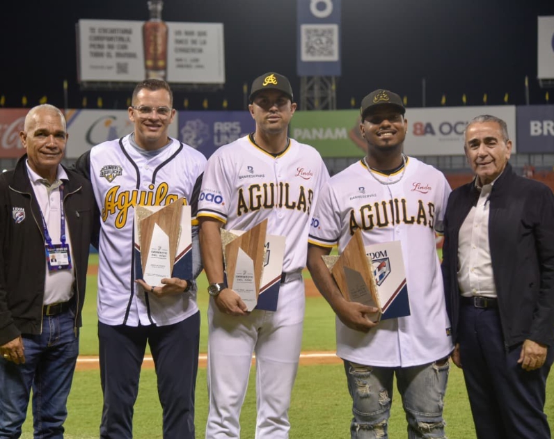 La entrega de los premios estuvo a cargo del presidente de las Águilas, Víctor García Sued; el coordinador de Operaciones de Lidom, Valentín Contreras.