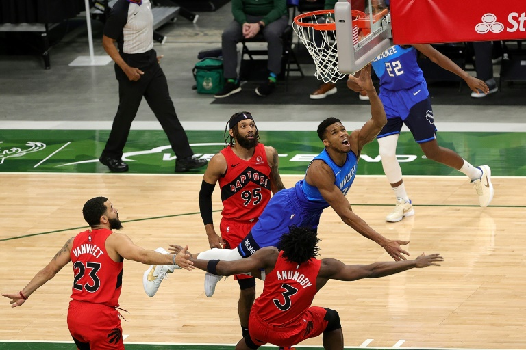 Giannis Antetokounmpo, de los Milwaukee Bucks, lanza a canasta defendido por OG Anunoby (#3), de los Toronto Raptors, durante el partido de la jornada del jueves de la NBA. Fuente Externa,