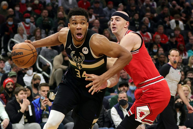 Alex Caruso (derecha), de los Chicago Bulls, defiende a Giannis Antetokounmpo durante el partido del viernes en la NBA. Fuente Externa.
