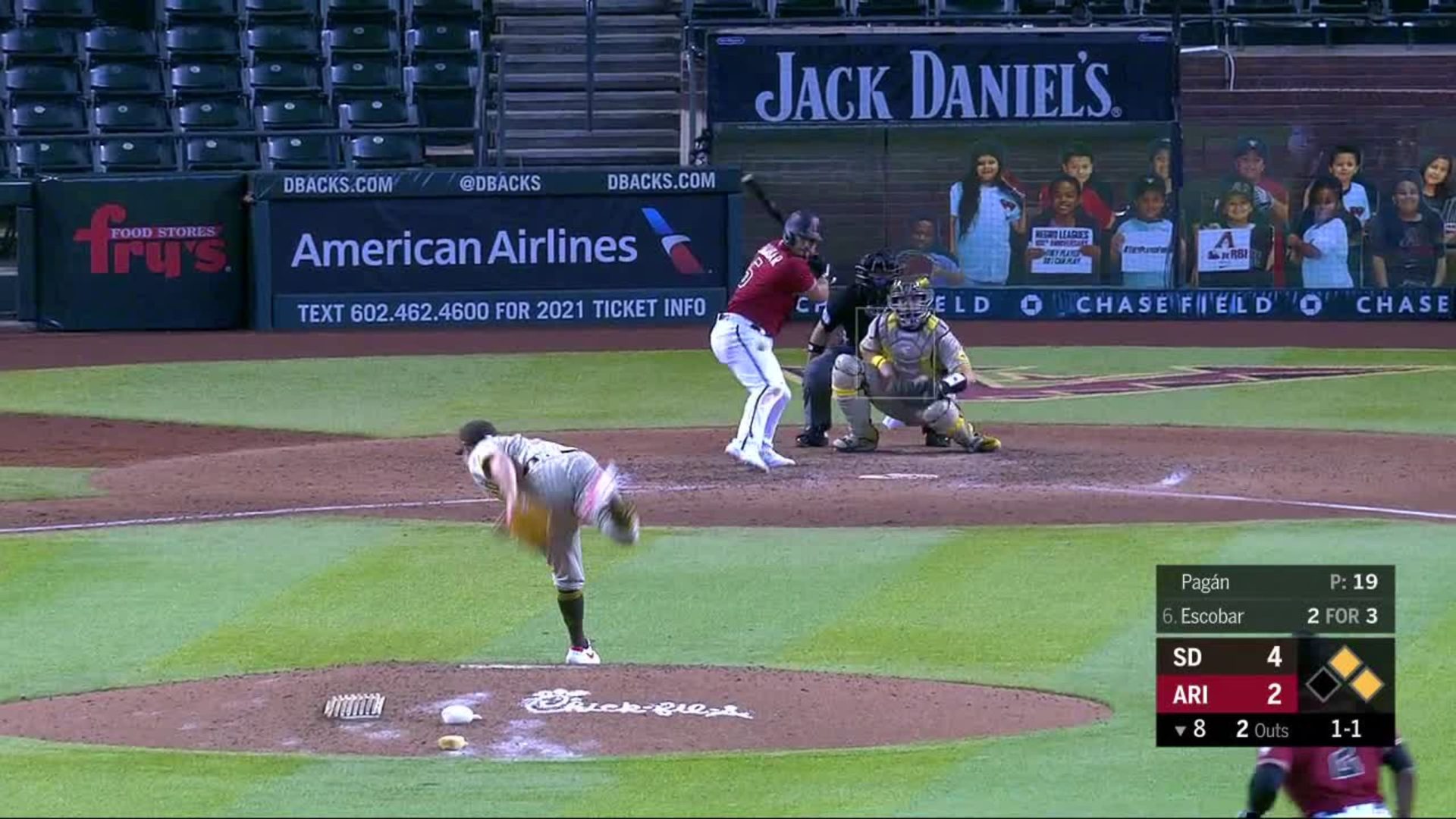 PHOENIX.- Eduardo Escobar disparó un cuadrangular de tres carreras que puso en ventaja a su equipo en la octava entrada y los Diamondbacks de Arizona ganaron el domingo 5-4 a los Padres de San Diego para completar la barrida de tres encuentros.