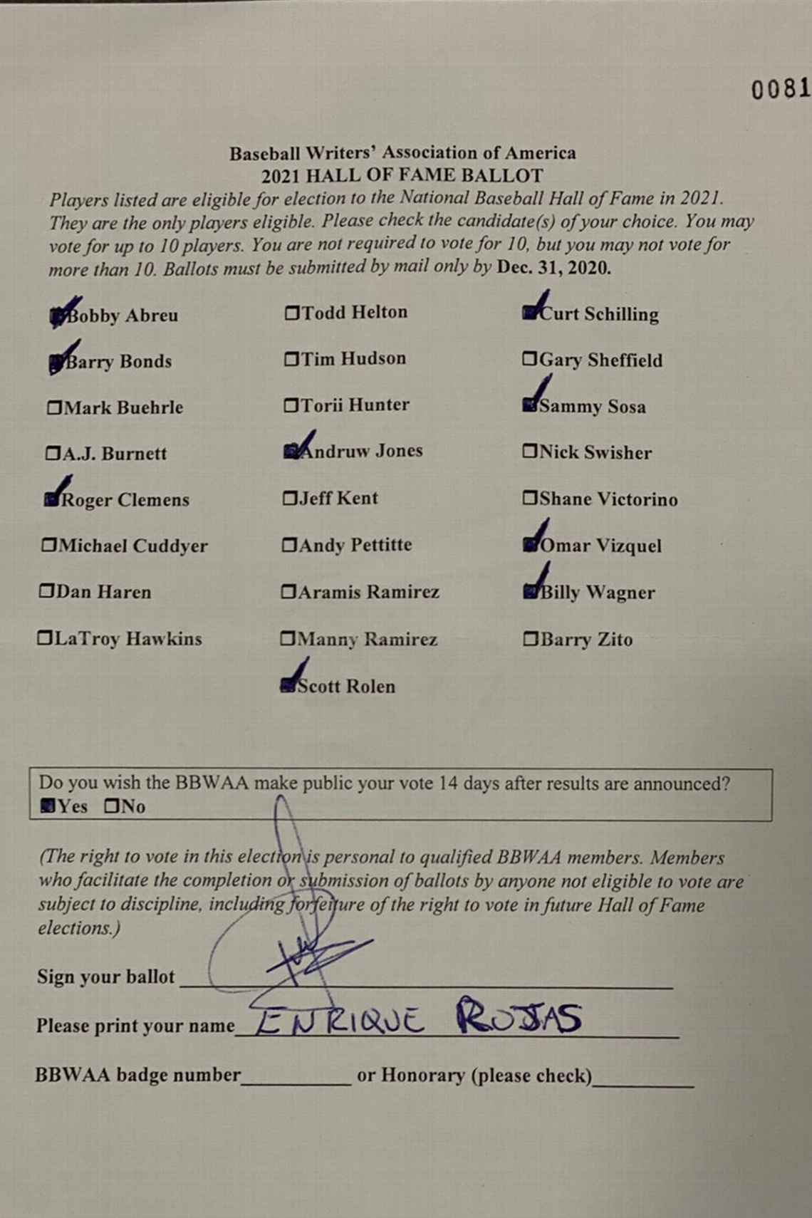 Esta es la boleta de votación del periodista dominicano Enrique Rojas para Cooperstown en el 2021. Enrique Rojas