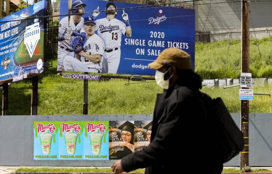 Un peatón con gorra y mascarilla camina por el Sunset Boulevard en Los Ángeles, el jueves 2 de abril de 2020, frente a un cartel que promueve el inicio de la temporada de béisbol de las Grandes Ligas. (AP Foto/Damian Dovarganes)