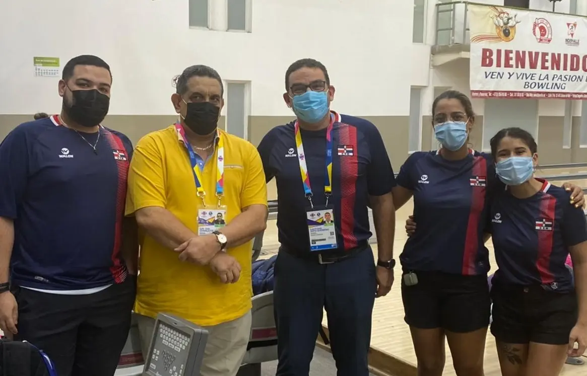 Luis Chanlatte, jefe de misión, junto al equipo de boliche, integrado por el entrenador David Márquez, Francis Soto, Carmina Hermon Vásquez y Ana Gabriela Soto Lora. Fuente Externa.