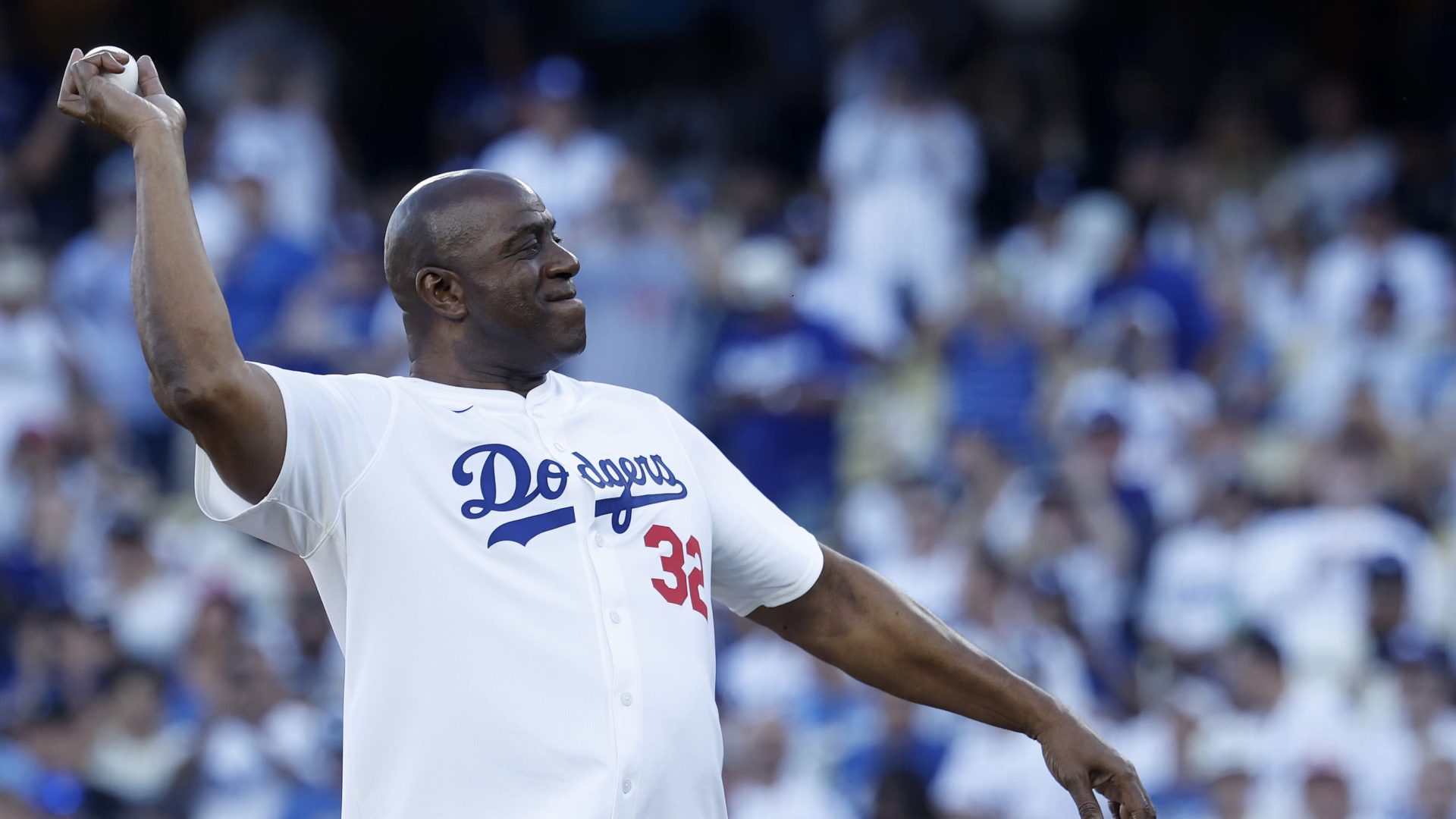 Ervin “Magic” Johnson, uno de los mejores jugadores en la historia del baloncesto de la NBA y cinco veces campeón con los Lakers de Los Ángeles como base del equipo entre 1979 y 1991 (y parte de la temporada de 1995-96), lanzó la primera bola el miércoles al receptor de honor, el torpedero estelar Mookie Betts. Y claro, lo hizo con su famoso número 32, pero con un jersey de los Dodgers.