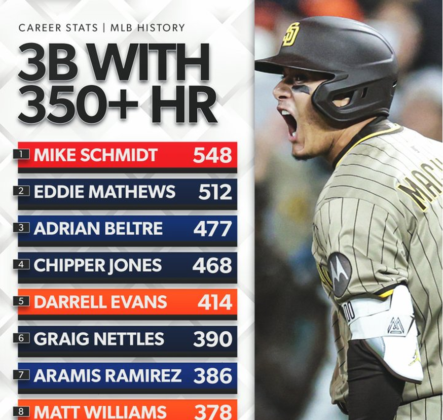 Manny Machado, sin duda, todo un baluarte de Padres de San Diego: se ha convertido en el décimo tercera base en la historia de la MLB de lograr en su carrera al menos 350 jonrones. Mis respetos.