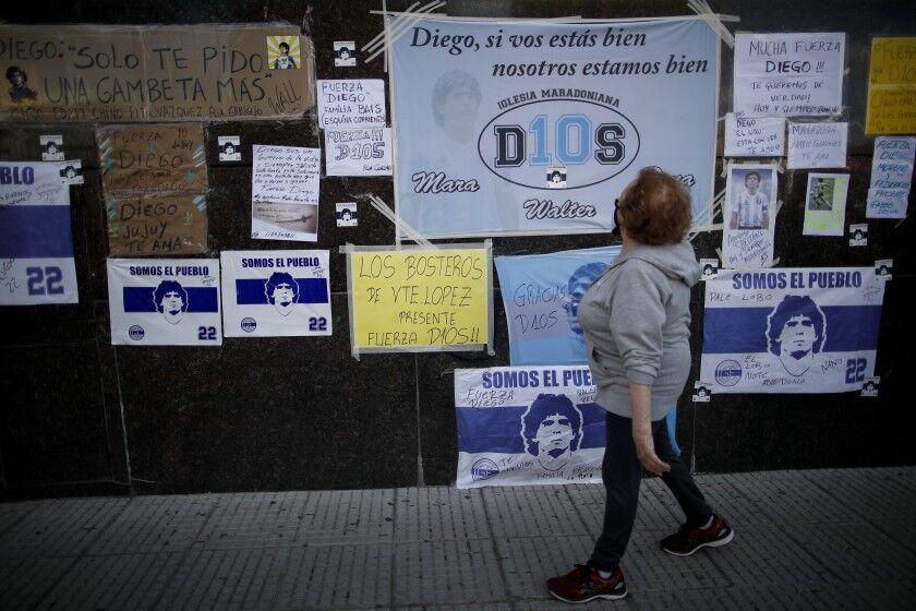 Una mujer observa un muro con mensajes de aliento a Diego Maradona en las afueras de la Clínica Olivos de Buenos Aires, donde la leyenda del fútbol mundial fue operado, el miércoles 4 de noviembre de 2020.(AP Foto/Natacha Pisarenko)
