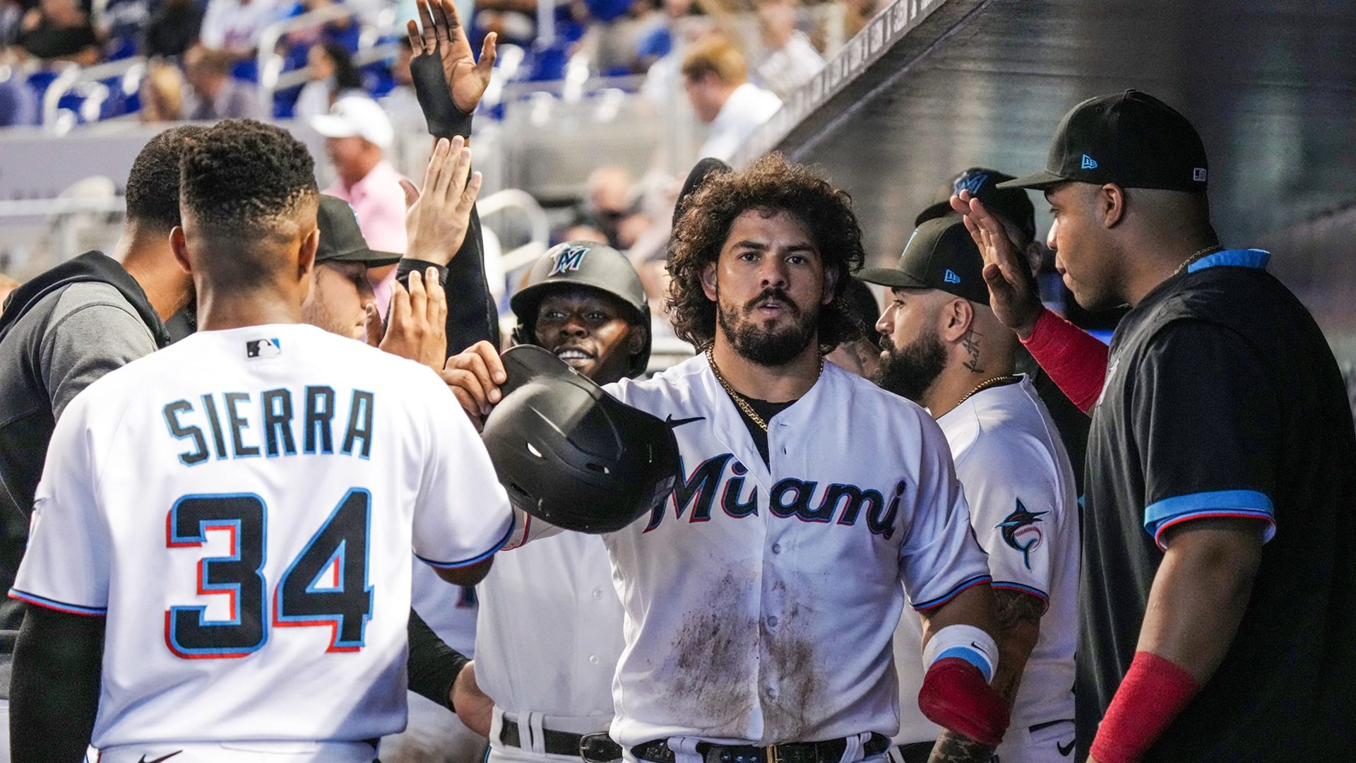 El venezolano Miguel Rojas negoció pasaporte con un out ante el dominicano Jeurys Familia (5-2) y avanzó a segunda con un sencillo de Jazz Chisholm. La línea de Alfaro al jardín derecho remolcó la carrera de Rojas, cuya barrida en el plato evadió el contacto del cátcher James McCann. Lewis Brinson siguió con un doblete de dos carreras.