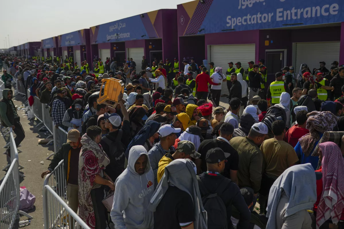 Hinchas hacen cola afuera del estadio Al Janoub en Wakrah, Qatar, el martes 13 de diciembre con la esperaba de obtener entradas para la semifinal del Mundial entre Marruecos y Francia el miércoles. (Francisco Seco / Associated Press) ASSOCIATED PRESS