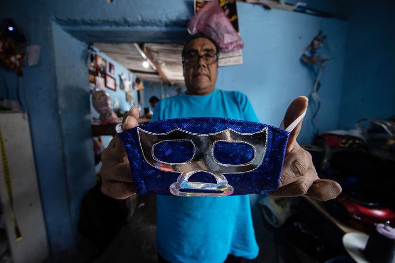 Estos protectores, muy codiciados en tiempos de pandemia, son confeccionados artesanalmente con los mismos colores y diseños de las máscaras de los luchadores más famosos de México por José Isaías Huerta, un ex peleador de 53 años conocido en sus años mozos como El Gato Gris.