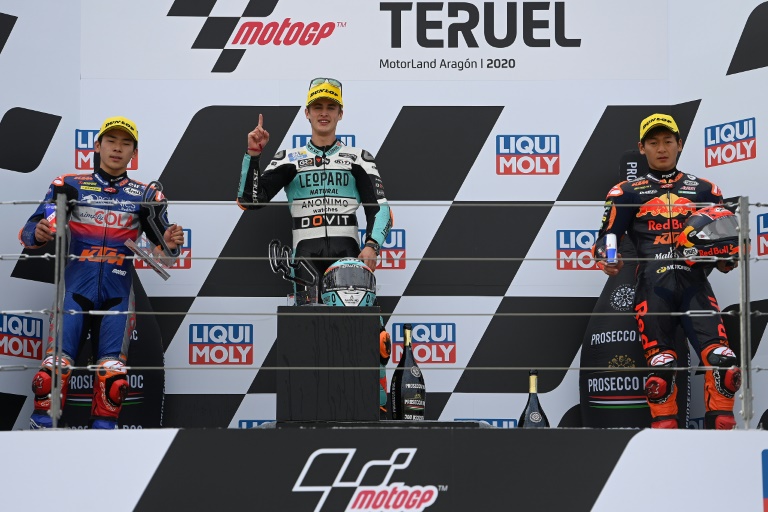 El español Jaume Masiá (centro), que ganó el Gran Premio de Teruel de Moto3, en Alcañiz, España, el 25 de octubre de 2020/ Fuente Externa