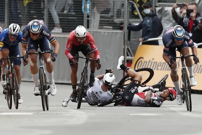 Unos kilómetros antes, fue su compatriota Primoz Roglic, segundo en la pasada edición del Tour, el que se fue al suelo junto a varios de sus compañeros en el grupo Jumbo y se reincorporó con un minuto de retraso sobre el pelotón a falta de 10 km para la meta.