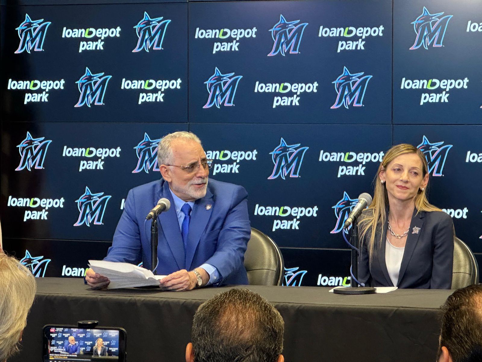 Vitelio Mejía Ortiz, presidente de Lidom habla en la rueda de prensa y observa la Sra. Caroline O’Connor, presidente de negocios de los Miami Marlins, Fuente Externa