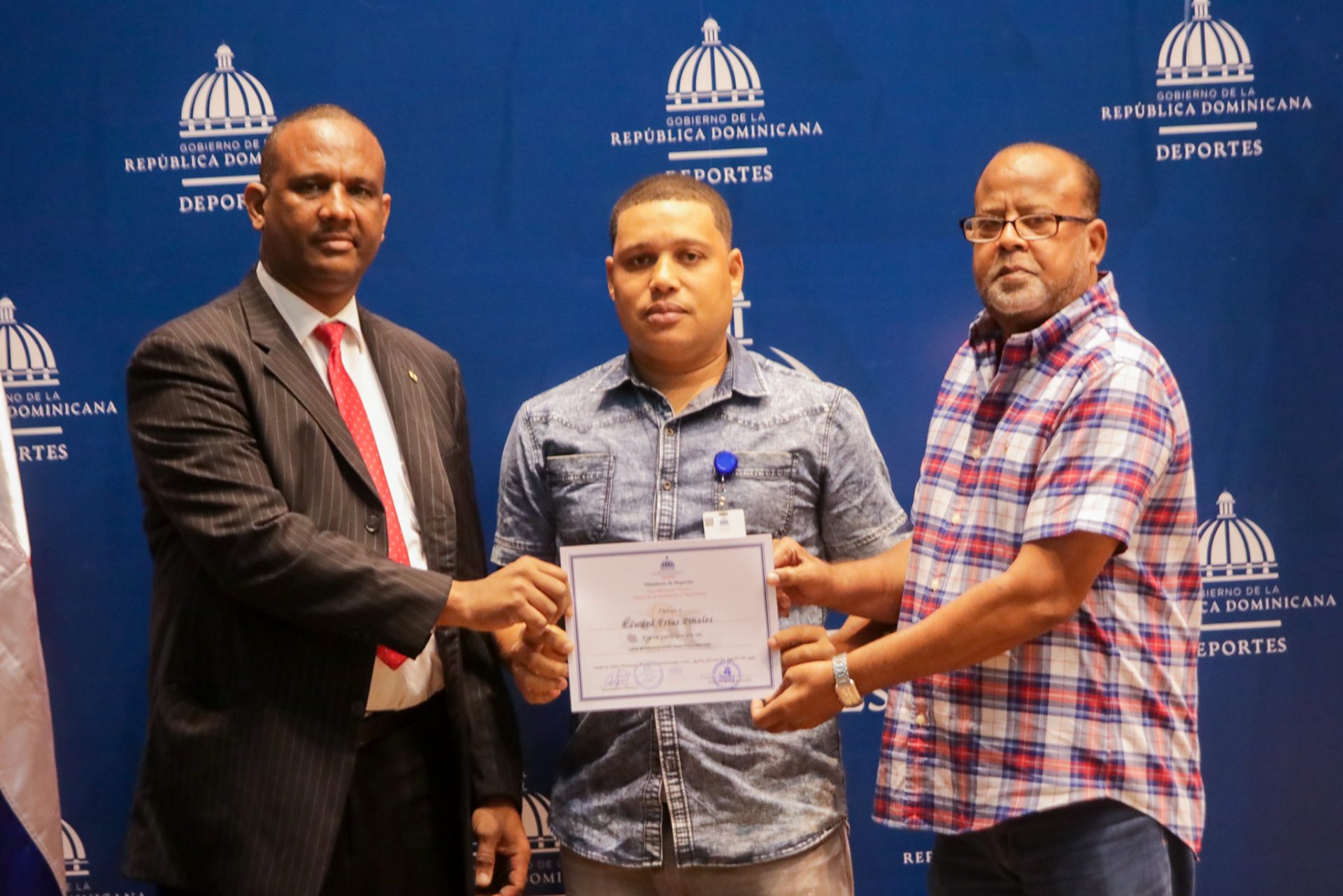 Técnicos del Ministerio de Deportes entregan un certificado a uno de los dirigentes de clubes graduado. Fuente Externa.