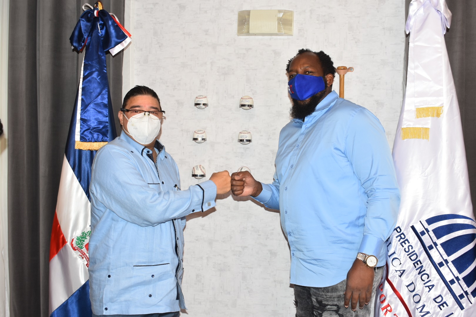 El ministro de Deportes, Francisco Camacho, y el inmortal de Cooperstown, Vladimir Guerrero, se saludan durante la visita que este último realizó al funcionario. Fuente Externa