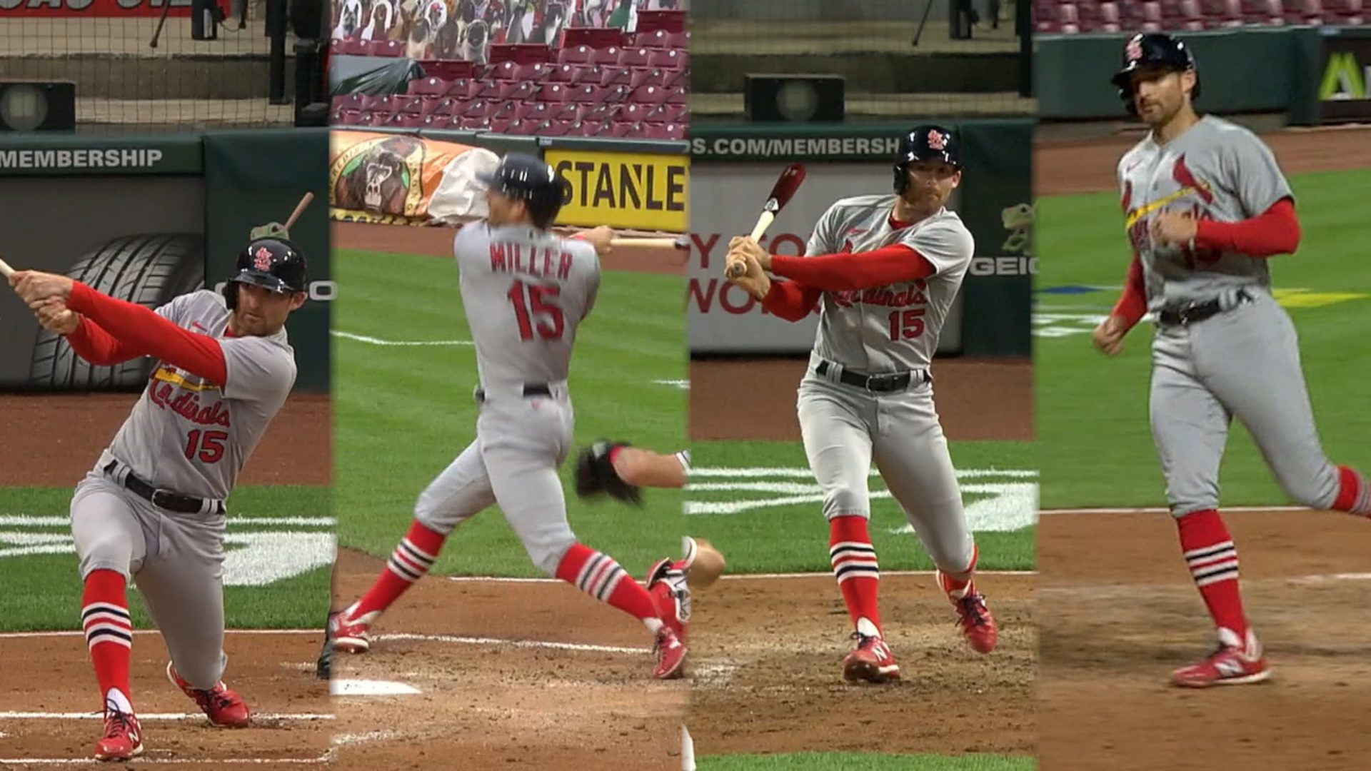 Miller encendió un ataque de seis carreras de San Luis en el primer inning ante Gray, mediante un doble que produjo un par. La pelota impactó el guante del intermedista Joey Votto, quien realizó una zambullida infructuosa.