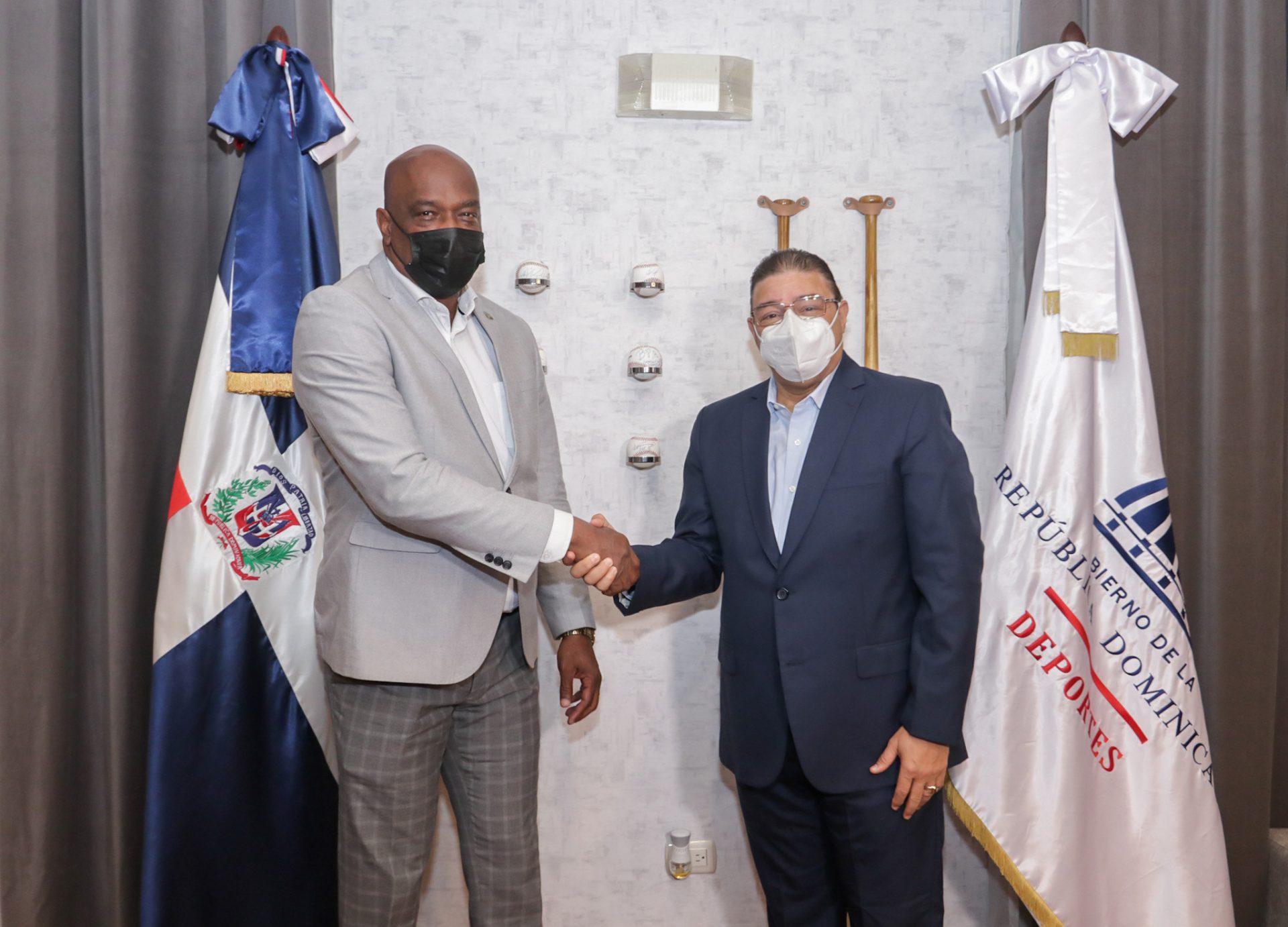 Los ministros de Deportes de Curazao, Sithree van Heydoorn y de República Dominicana, Francisco Camacho, intercambian saludos durante la visita girada por el funcionario curazoleño a su homólogo quisqueyano. Fuente Externa.