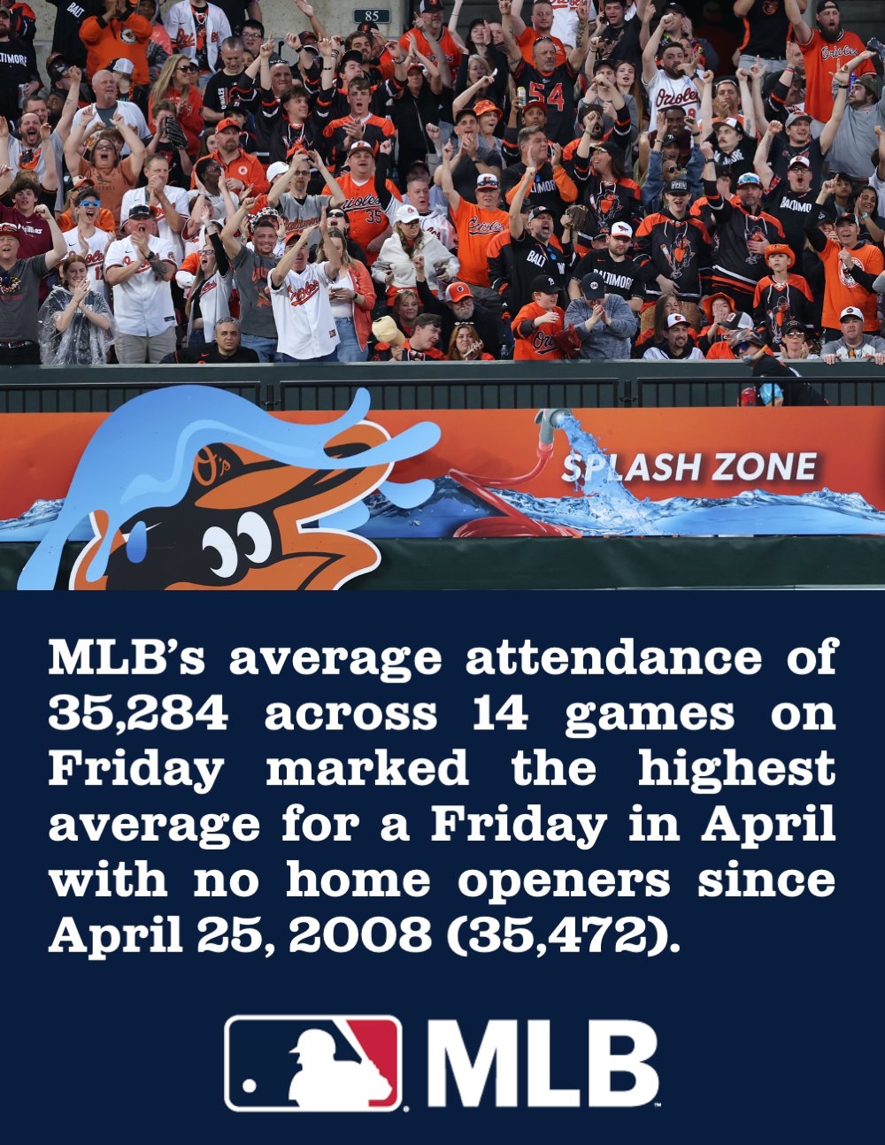 La asistencia promedio de los 14 juegos disputados registró una impresionante cifra de 35,284 – la asistencia media más alta para un viernes de abril sin juegos inaugurales en casa desde el 25 de abril del 2008 (35,472).