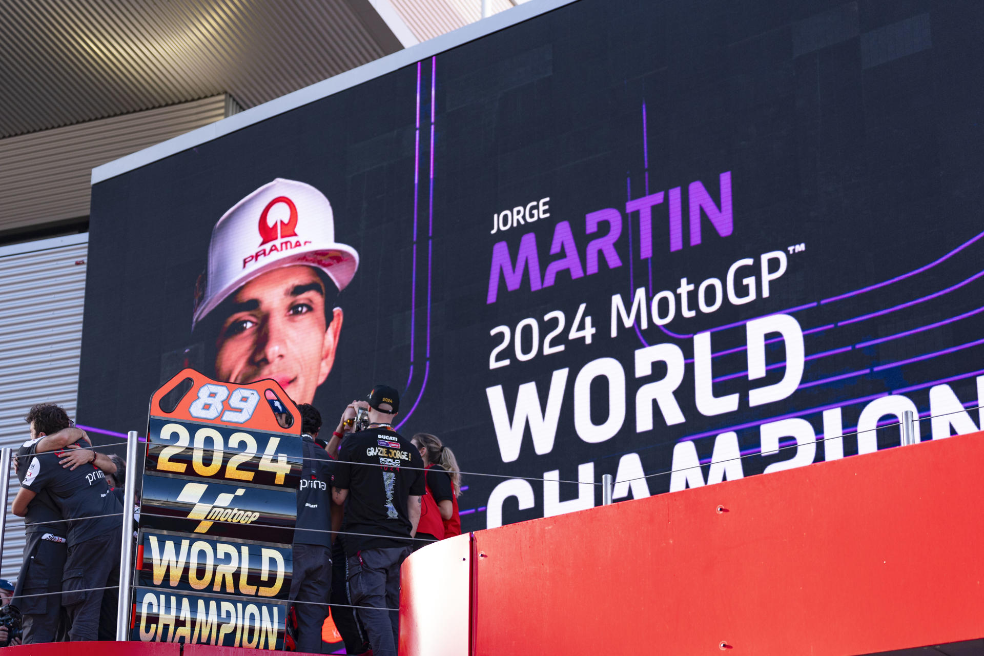 El español Jorge Martín celebra su conquista del Campeonato del Mundo de MotoGp, el 17 de noviembre de 2024, en el circuito de Montmeló. EFE/ Siu Wu