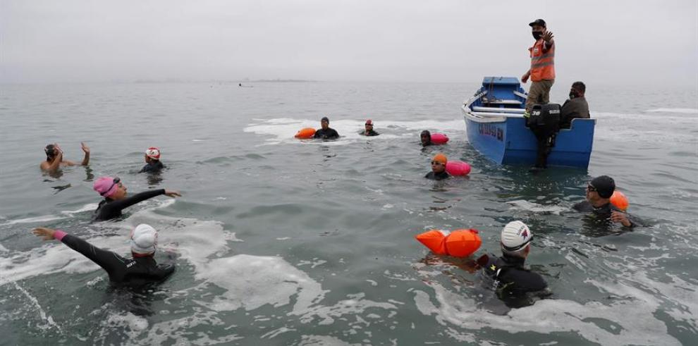 LIMA, Perú.- Una de las pocas disciplinas deportivas que se ha mantenido durante la pandemia del coronavirus en Perú es la natación, que debido al cierre de las piscinas se ha trasladado al mar abierto y este sábado recorrió más de cinco kilómetros entre una isla frente al Callao y la costa capitalina.