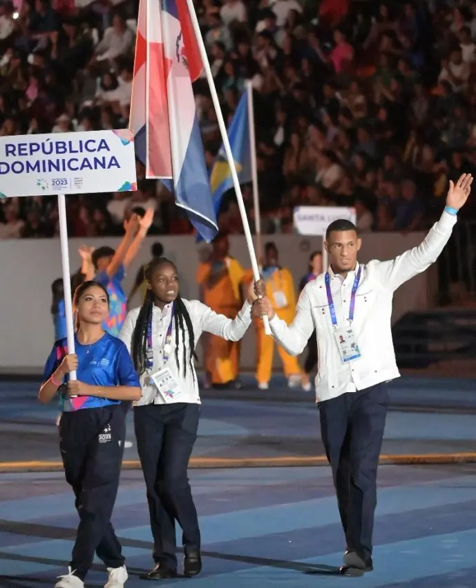 Alegres y felices los atletas dominicanos en el desfile de apertura de los Juegos Centroamericanos y del Caribe de San Salvador 2023. Fuente Externa