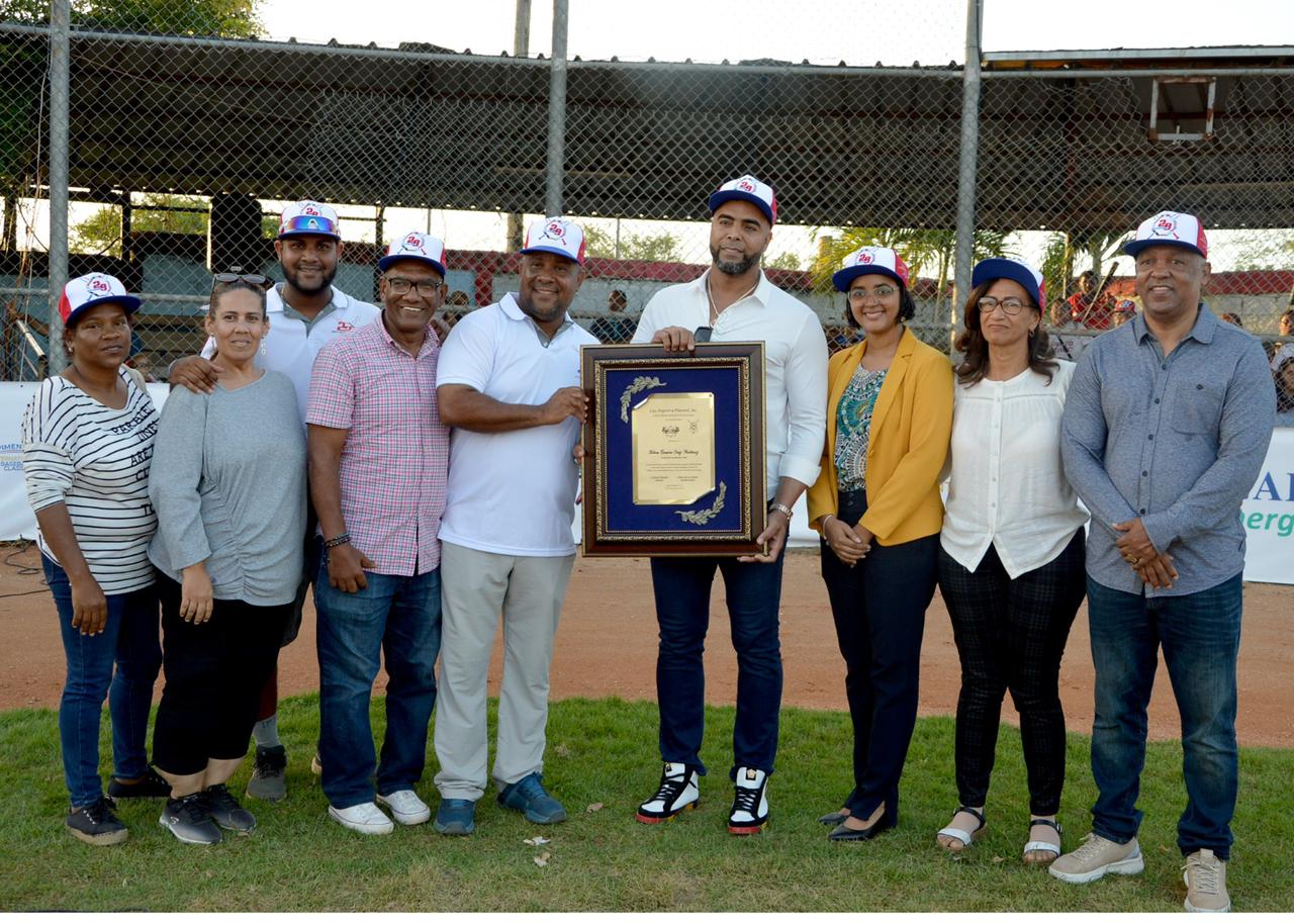 Luego el dirigente Cristian Pimentel, presidente de la entidad organizadora, junto a Omar de los Santos y Deicy Bobadilla hizo entrega de una placa de reconocimiento a Nelson, Fernando Geraldino, de la empresa Seaboard, y al licenciado Juan Núñez Nepomuceno, presidente de la Federación Dominicana de Béisbol (Fedom).