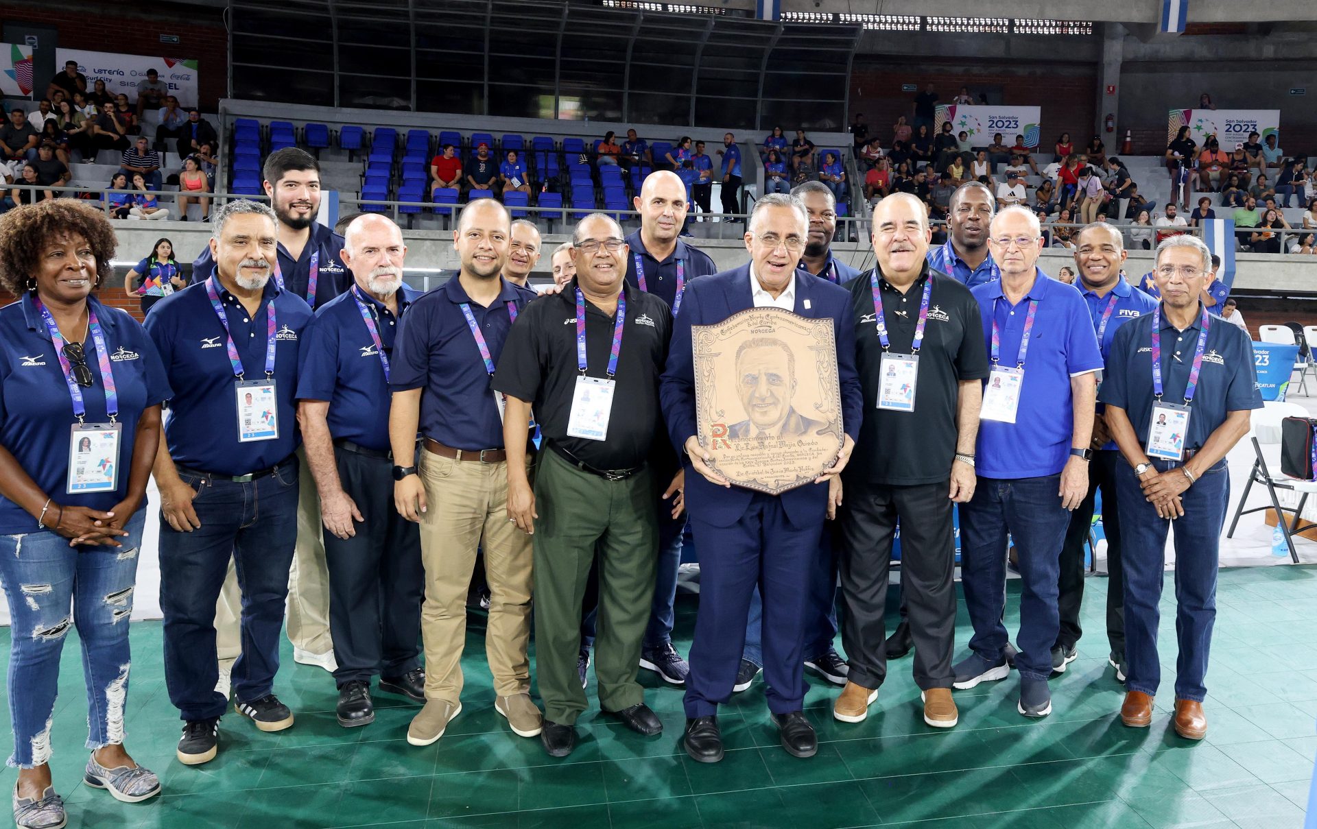 El Presidente de NORCECA, el dominicano Cristóbal Marte Hoffiz, junto al Primer Vicepresidente de NORCECA, el cubano Ariel Sainz, hicieron entrega del reconocimiento a Mejía Oviedo previo al inicio del partido de semifinal del voleibol femenino de los XXIV Juegos Centroamericanos y del Caribe San Salvador 2023 entre la República Dominicana y Cuba.