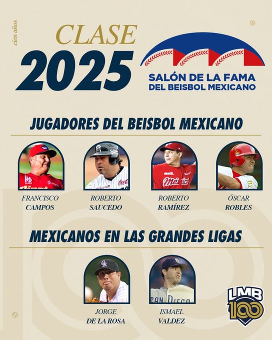 ECO: Francisco Campos, Roberto “Metralleta” Ramírez, Oscar Robles y Roberto Saucedo como jugadores del beisbol mexicano; Jorge de la Rosa e Ismael Valdez –Ligas Mayores, así como el Ing. Enrique Mazón Rubio –directivo—quien entró de forma directa, son los nuevos inmortales 2025 del Salón de la Fama del Beisbol Mexicano.