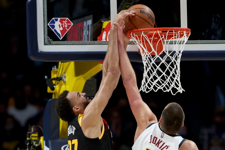 Rudy Gobert #27 de los Utah Jazz y Nikola Jokic #15 de los Denver Nuggets en duelo disputado en Denver, Colorado, por la temporada regular de la NBA el 16 de enero de 2022. Matthew Stockman/Getty Images/AFP