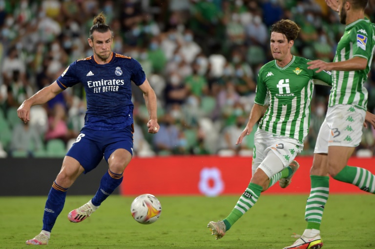 El delantero galés del Real Madrid Gareth Bale (I) es marcado por el defensa español del Betis, Juan Miranda, durante el partido de la Liga española en el estadio Benito Villamarín de Sevilla, el 28 de agosto de 2021. Fuente Externa.
