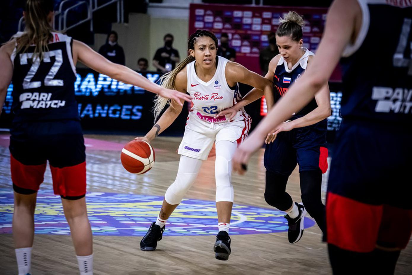 Arella Guirantes, de Puerto Rico, intenta mover el balón ante la defensa de varias jugadoras rusas. (Suministrada / FIBA)