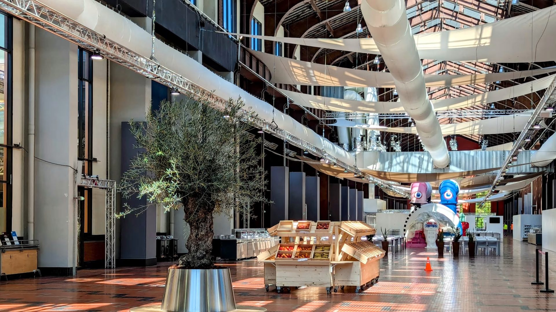 Para llegar al restaurante de la Villa Olímpica y Paralímpica hay que cruzar una majestuosa callejuela flanqueada por más de 200 banderas. Sin embargo, el interior del restaurante es aún más impresionante. Enclavado en la nave de la Cité du Cinéma de Saint-Denis, a las afueras de París, los comedores ofrecen un marco encantador.