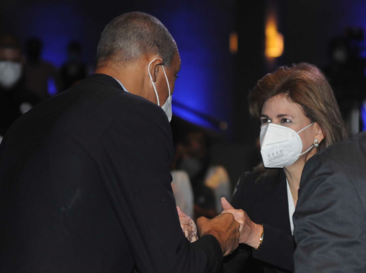 El ex ministro de Deportes Felipe Payano, saluda a la vicepresidenta de la República, Raquel Pena, luego de concluir su ponencia en la Cumbre del Deporte. Fuente Externa