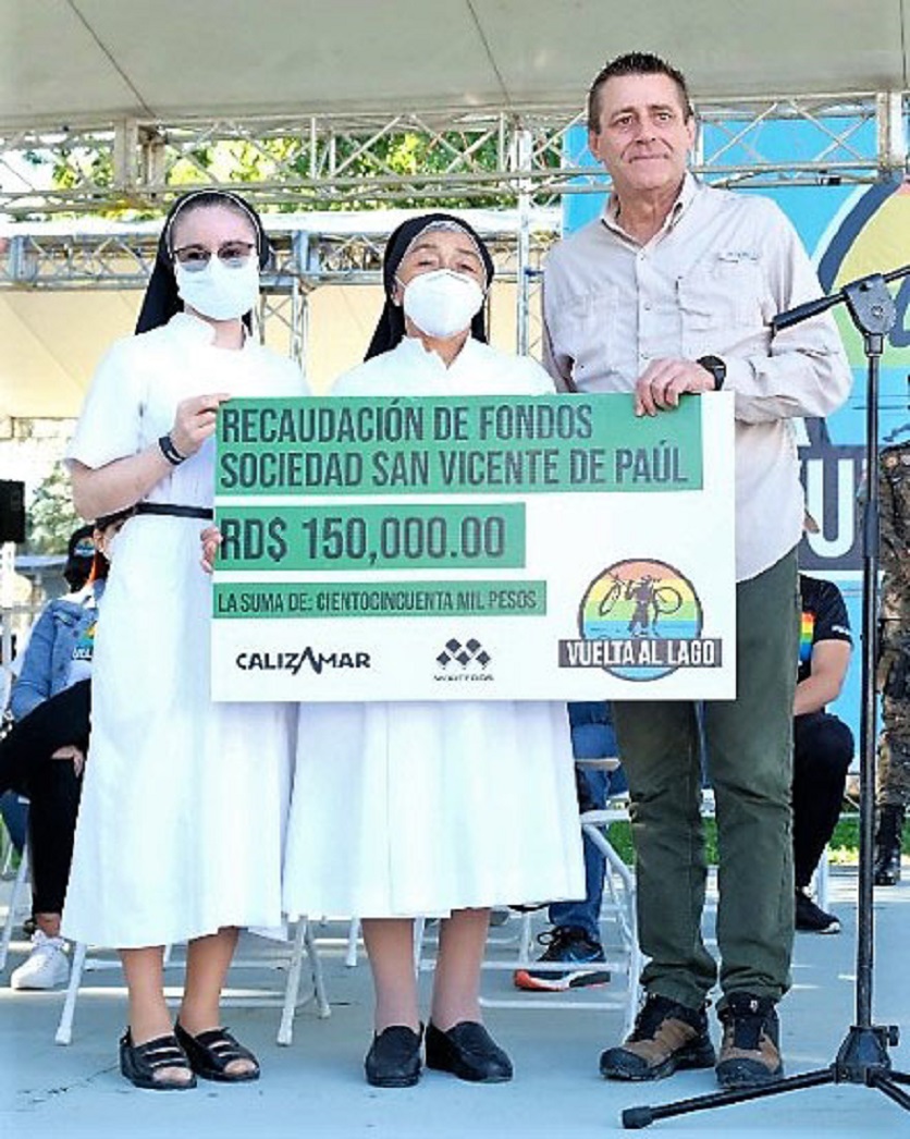 En el inicio de la competencia, en la que participaron más de cien pedalistas, el director general de Calizamar, Fruela Roces, hizo entrega a la Sociedad San Vicente de Paúl, de Santiago, representada por las hermanas religiosa, sor Edith y sor María Cecilia, de la cantidad recaudada, 150 mil pesos, de las inscripciones de la Vuelta al Lago.