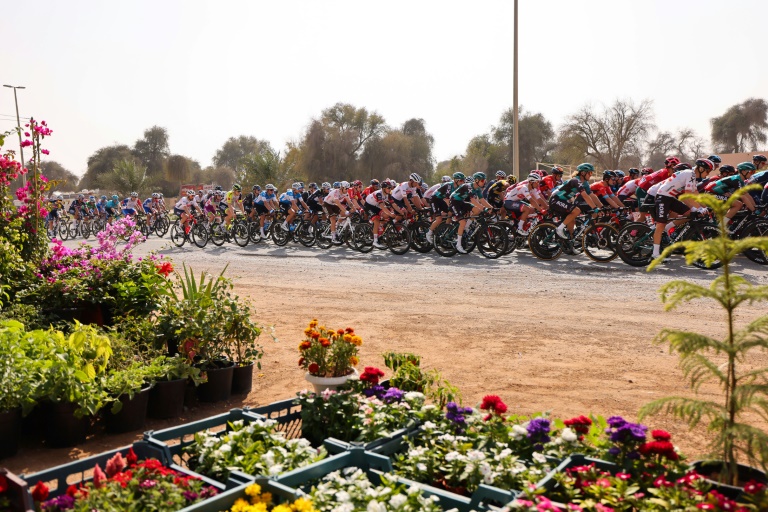 El pelotón del UAE Tour pasa por un mercados de flores durante la cuarta etapa, entre Fujairah Fort y Jebel Jais, el 23 de febrero de 2022. Fuente Externa.